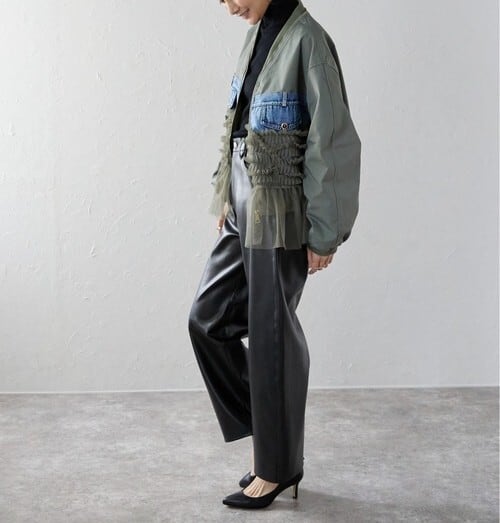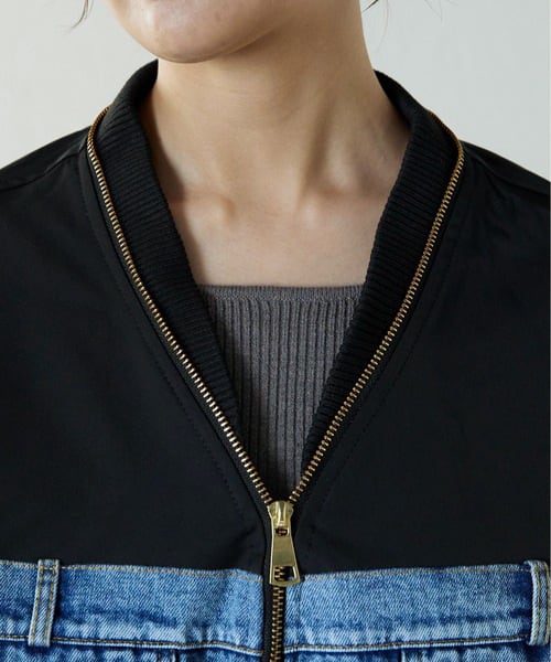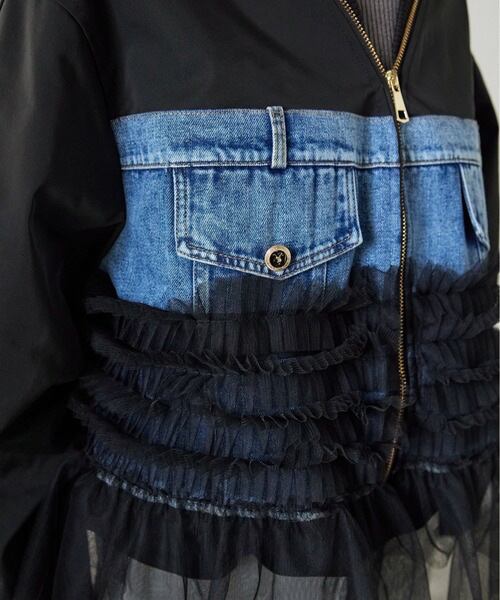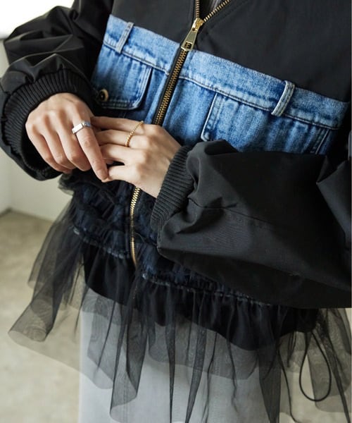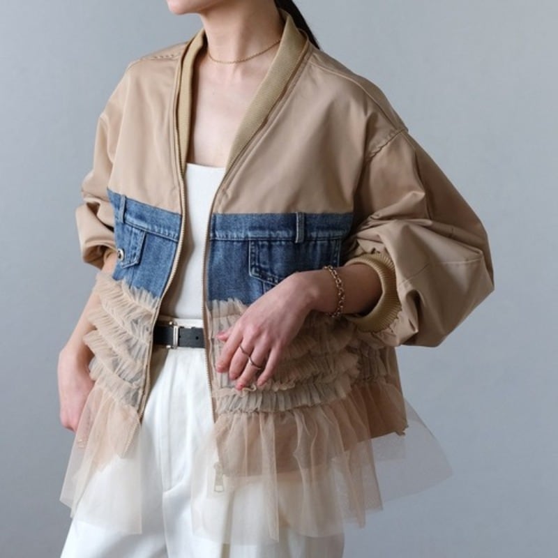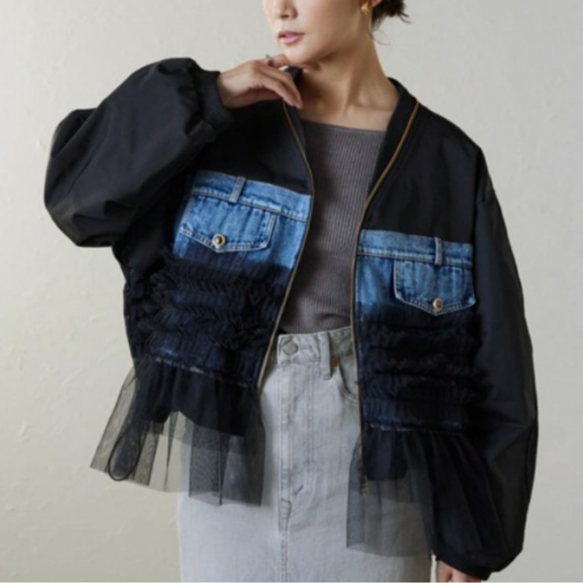 羽織るだけで細見え◎デニム×メッシュ切替 ビッグポケット スタジャン風レディースジャケット